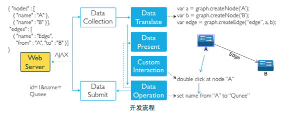 用户交互时,会对数据进行修改,直接对Qunee元素设置属性或者样式,界面会自动实时刷新,呈现修改后的效果,比如双击修改元素名称,可以参照下面的代码: